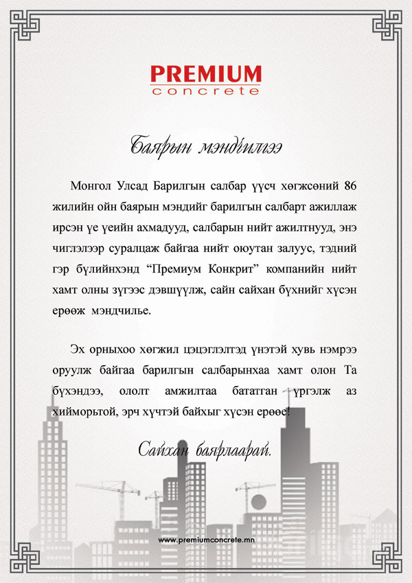 Монгол Улсад Барилгын салбар үүсч хөгжсөний 86 жилийн ойн баярын мэндийг барилгын салбарт ажиллаж ирсэн үе үеийн ахмадууд, салбарын нийт ажилтнууд, энэ чиглэлээр суралцаж байгаа нийт оюутан залуус, тэдний гэр бүлийнхэнд “Премиум Конкрит” компанийн нийт хамт олны зүгээс дэвшүүлж, сайн сайхан бүхнийг хүсэн ерөөж мэндчилье.